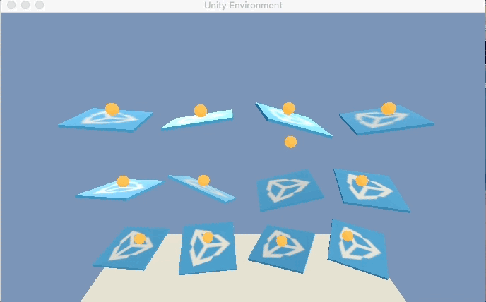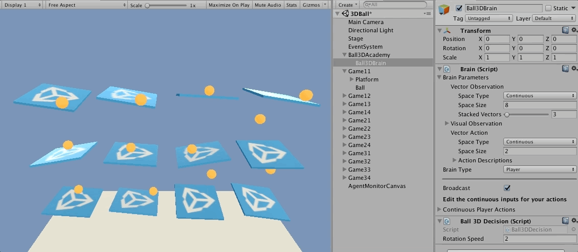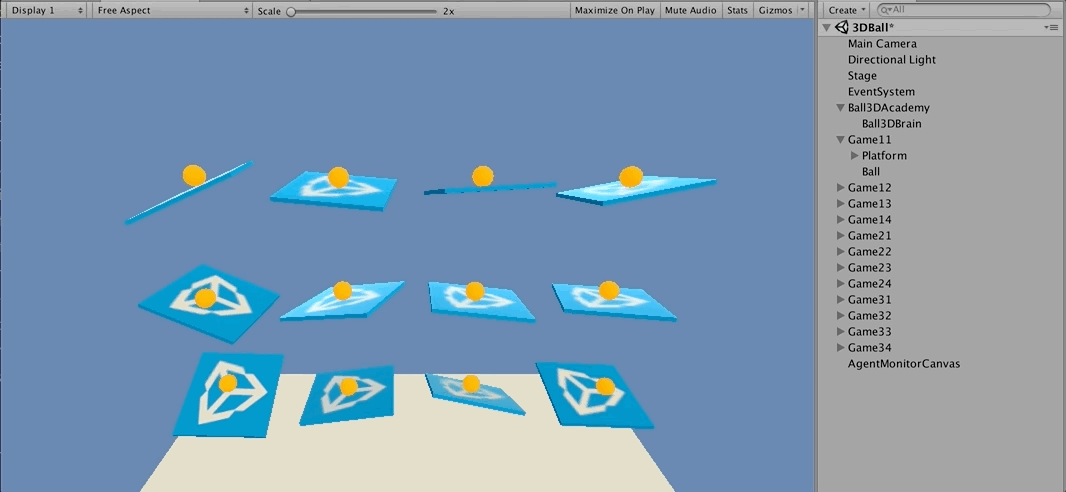 By default, the untrained models will look something like this. Balls will drop and the platforms don’t know how to move unless you attempt to move them manually (not exactly efficient):